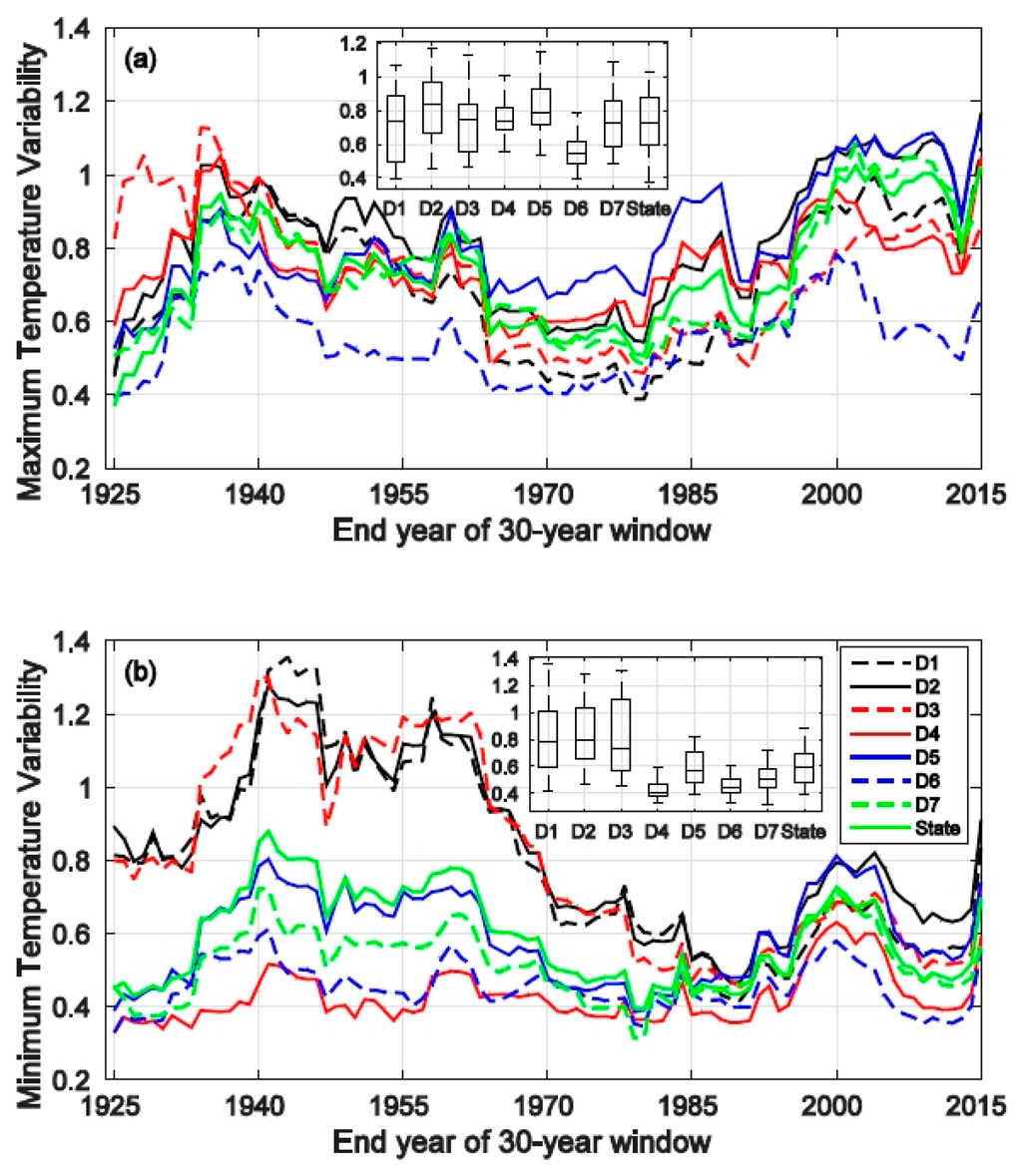 Similar to the case of the annual average temperature, a repeating increasing-decreasing trend is observed in the annual minimum temperature variability (Figure 5b). In addition, the variabilities in the annual minimum temperature of the four southern regions (D4–D7) are consistently less than one. This shows that the annual minimum temperatures of those four regions are generally less variable than usual. Furthermore, the median variabilities of the three northern regions (D1–D3) are also less than one. It is also evident that the variabilities of these southern regions before 1984 are distinctly higher than those of the four northern regions. The correlations among these three regions (D1–D3) are consistently above 0.95.