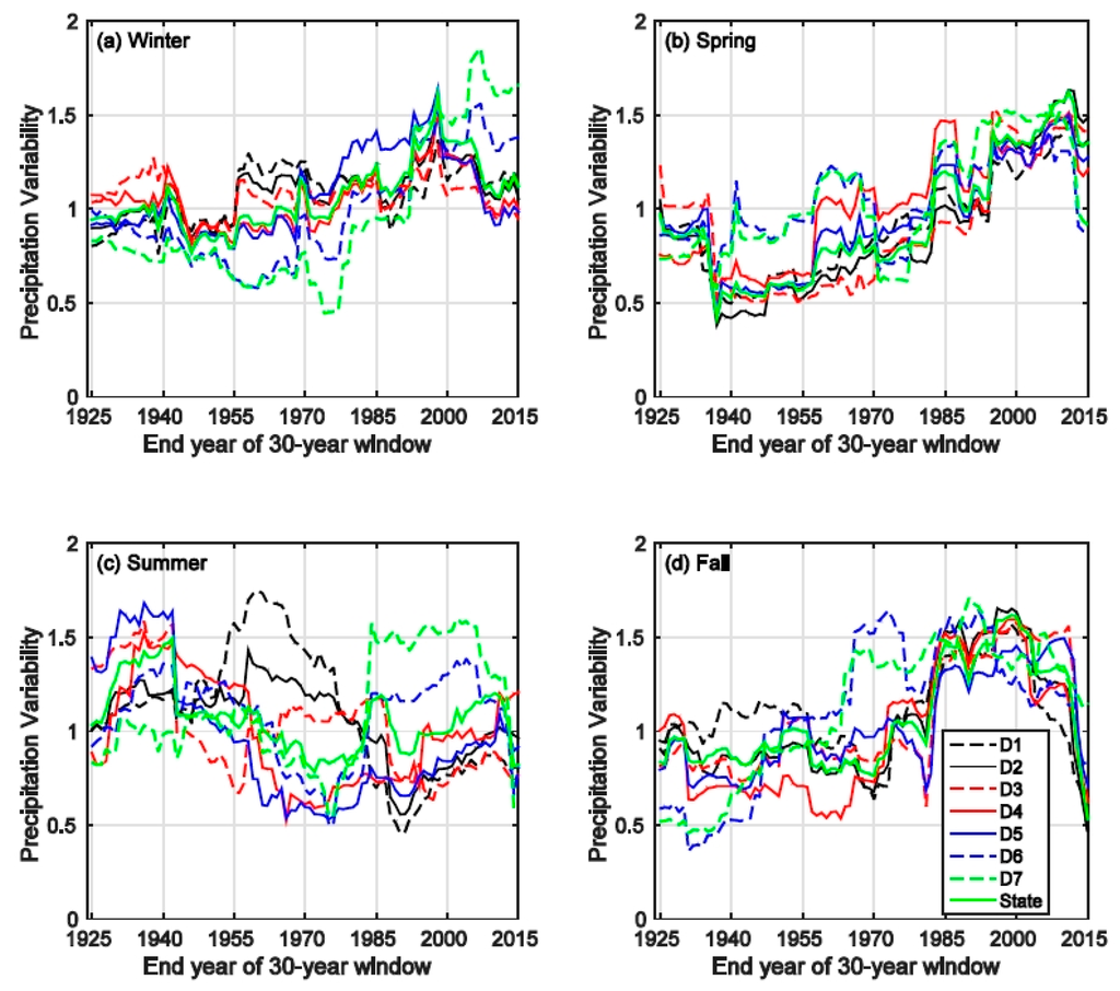 In a new finding, this study indicates that annual, winter and spring precipitation variabilities generally have an increasing tendency for every region. This implies the increasing frequency of precipitation extremes, which is also projected to occur throughout the 21st century with continuing warming expected [59,60,61,62,63]. The variabilities of annul and winter precipitation in the Northeast Desert Drainage vary in the widest ranges out of all seven regions.