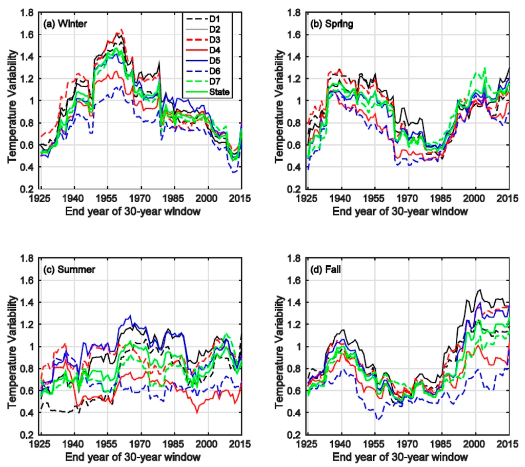 Winter, spring and fall temperature variabilities all exhibit cyclic patterns, while there is no evident pattern in summer temperature variability (Figure 7). The overall winter temperature variability peaks around the early 1960s for most regions and then starts declining till around 2013. After 1985, the variabilities are mostly less than one (Figure 7a). The general spring temperature variability first peaks in the late 1930s, followed by a declining trend till around 1985; after that, the variabilities for all regions start increasing till around 2004. A dip is observed after 2004 with the lowest variabilities occurring around 2008 (Figure 7b). The overall fall temperature variability first peaks at around 1940 for most regions and then declines till the late 1960s. It starts increasing again till 2001; after that, it becomes relatively stable (Figure 7d). In general, the variation range in winter (summer) is the largest (smallest). These cyclic patterns are also observed in the maximum temperature variability and minimum temperature variability (not shown) in winter, spring and fall. The only exception is that the minimum temperature variability exhibits no apparent pattern in fall. In summer, similarly, there are no evident patterns in the variabilities of maximum and minimum temperatures.
