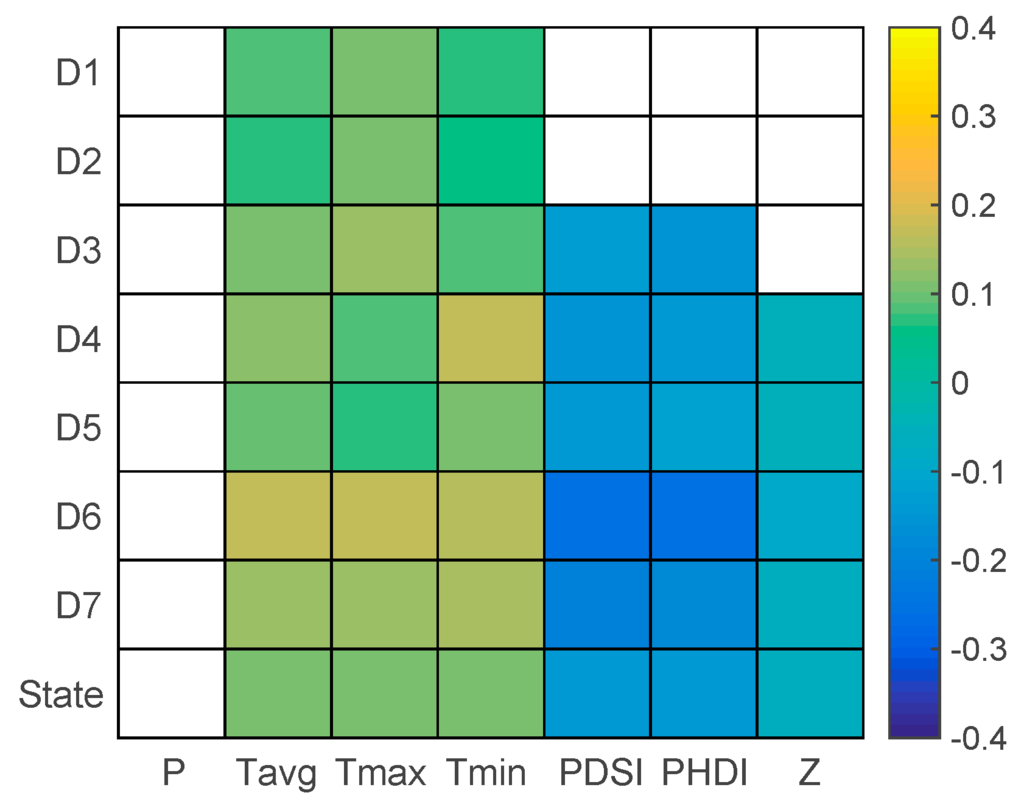 In spite of its advantageous properties and wide popularity among researchers, the Palmer Index applied in this study may not be the most appropriate choice for the snow impacted mountainous regions across the state. This is mostly due to the insufficient representation of the snow storage processes in the two-layer model used in deriving the Palmer Index. Nevertheless, this study focuses on the qualitative trend rather than the quantitative severity of drought. The specific values of drought indices have very marginal (if any) implications on the main findings of this study, as long as they are determined in the same manner. The alternatives of the Palmer Index, including the standardize precipitation (evapotranspiration) and runoff indices [85,86,87,88], are under evaluation and will be presented in our future work.
