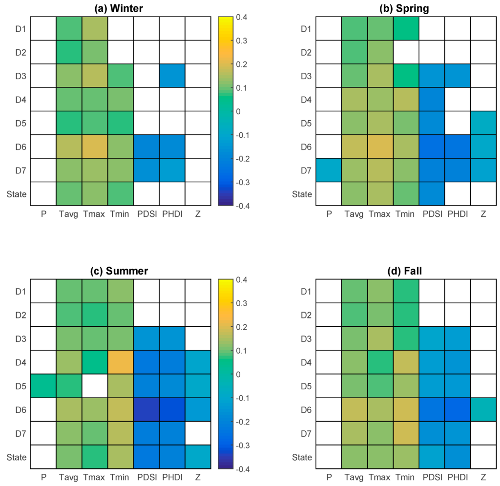 Slope of the significant trends of seasonal variables (per decade; the white color indicates no trends). Study variables and region names are shown in the X-axis and Y-axis, respectively. (a) Winter; (b) Spring; (c) Summer; (d) Fall.