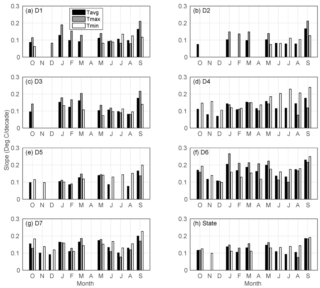 Slope of significant trends of monthly temperature for regoins (a) North Coast Drainage (D1); (b) Sacramento Drainage (D2); (c) Northeast Interior Basin (D3); (d) Central Coast Drainage (D4); (e) San Joaquin Drainage (D5); (f) South Coast Drainage (D6); (g) Southeast Desert Basin (D7); (h) State from October (O) to September (S).