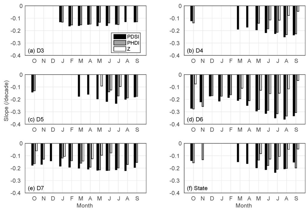 Drought indices show trends for most regions, except for the North Coast Drainage and Sacramento Drainage (Figure 12). These two regions are thus not presented. Regions including the Northeast Interior Basin (D3), Central Coast Drainage (D4) and San Joaquin Drainage (D5) see no trends in any of the drought indices in certain months (October–December for D3; November–February for D4 and D5) (Figure 12). For regions and months where trends are identified, the trends are consistently negative (declining). Most significant trends generally occur over the South Coast Drainage (D6). In contrast, the trends observed in the Northeast Interior Basin (D3) have relatively milder slopes (greater than −0.2/decade). Among three indices, the Z Index has the least frequent and least significant trend (characterized by a mild slope, should the trend exist). The trend in PDSI is the most significant in spring and summer months (March–August). Statewide, no trends are observed in winter months (December–February). However, declining trends exist for all three indices from May–September where the trend in the Z Index is normally the least significant. In September and October, the trend in PHDI is more significant than that of PDSI.
