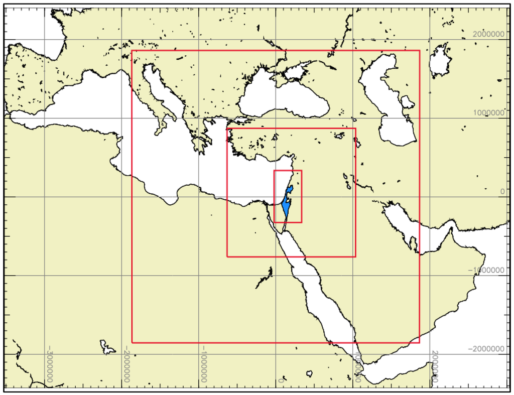 Map of the three nested Grids of Weather Research and Forecasting (WRF) simulations at the east Mediterranean (D1 = 27 km, D2 = 9 km, D3 = 3 km).