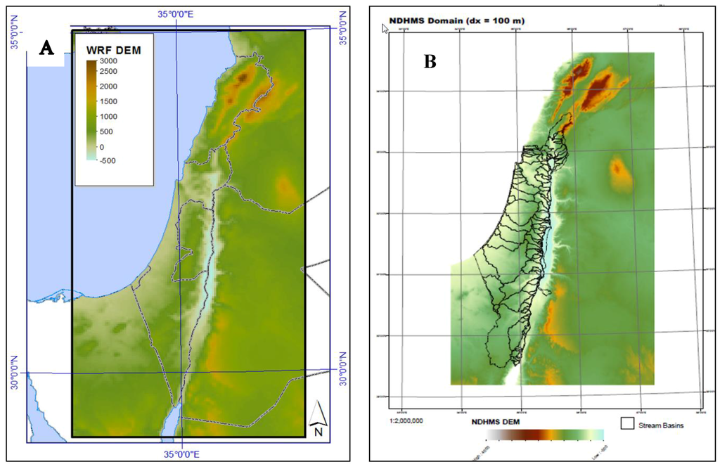 The domain in this study covers areas in southern Lebanon, Israel, West Jordan and Eastern Sinai. Figure 1 and Figure 2 show the WRF and WRF-Hydro modeling domains, respectively. For the two-way coupled model experiments, the distributed hydrological routing functions contained within the WRF-Hydro extension package were activated only on the innermost WRF domain (D03, see below).