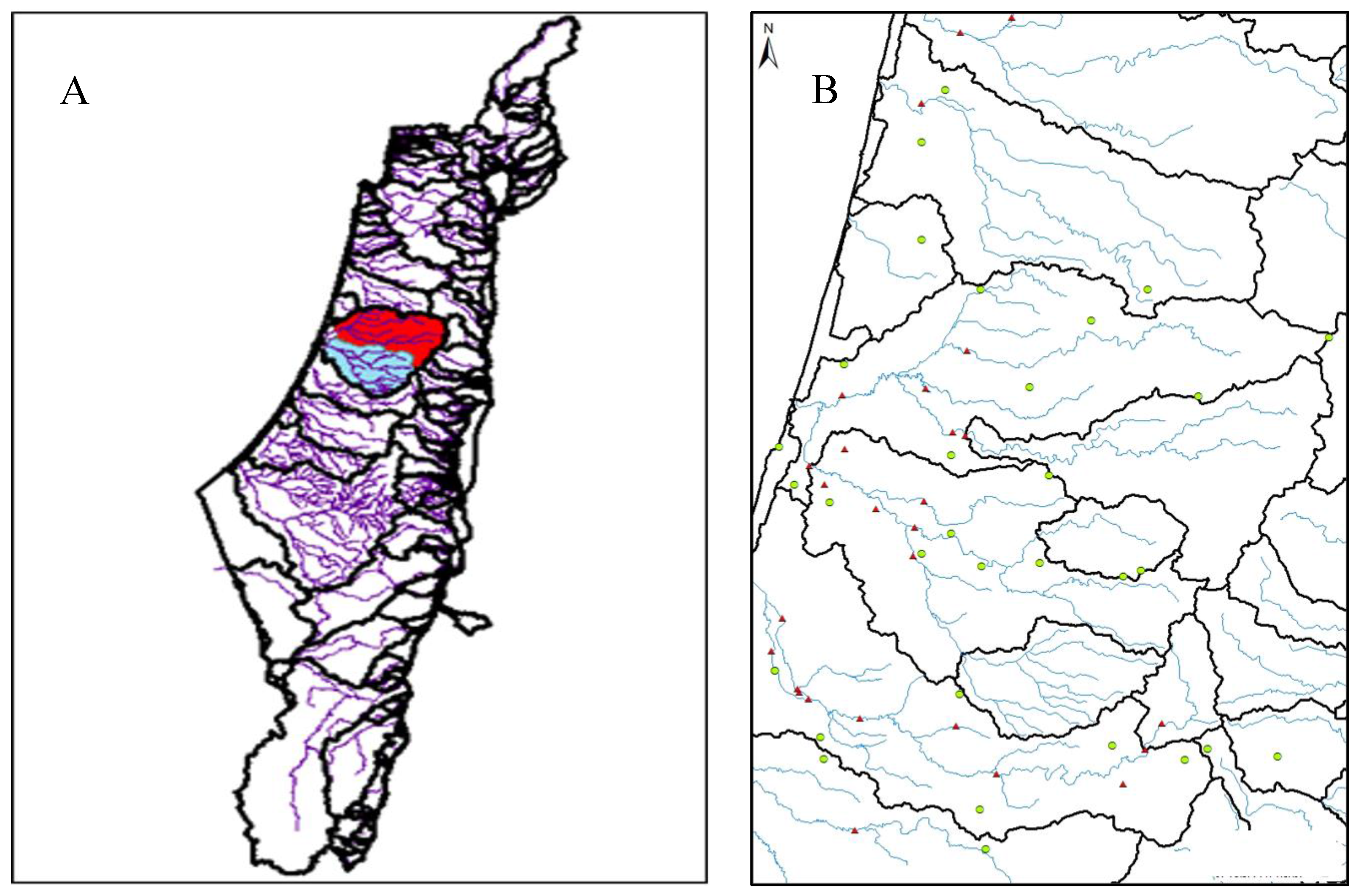The location of the Yarqon-Ayalon basin in central Israel (A) and the rain gauges (im green circles) and hydrometric stations in (red triangle) the basin (B).