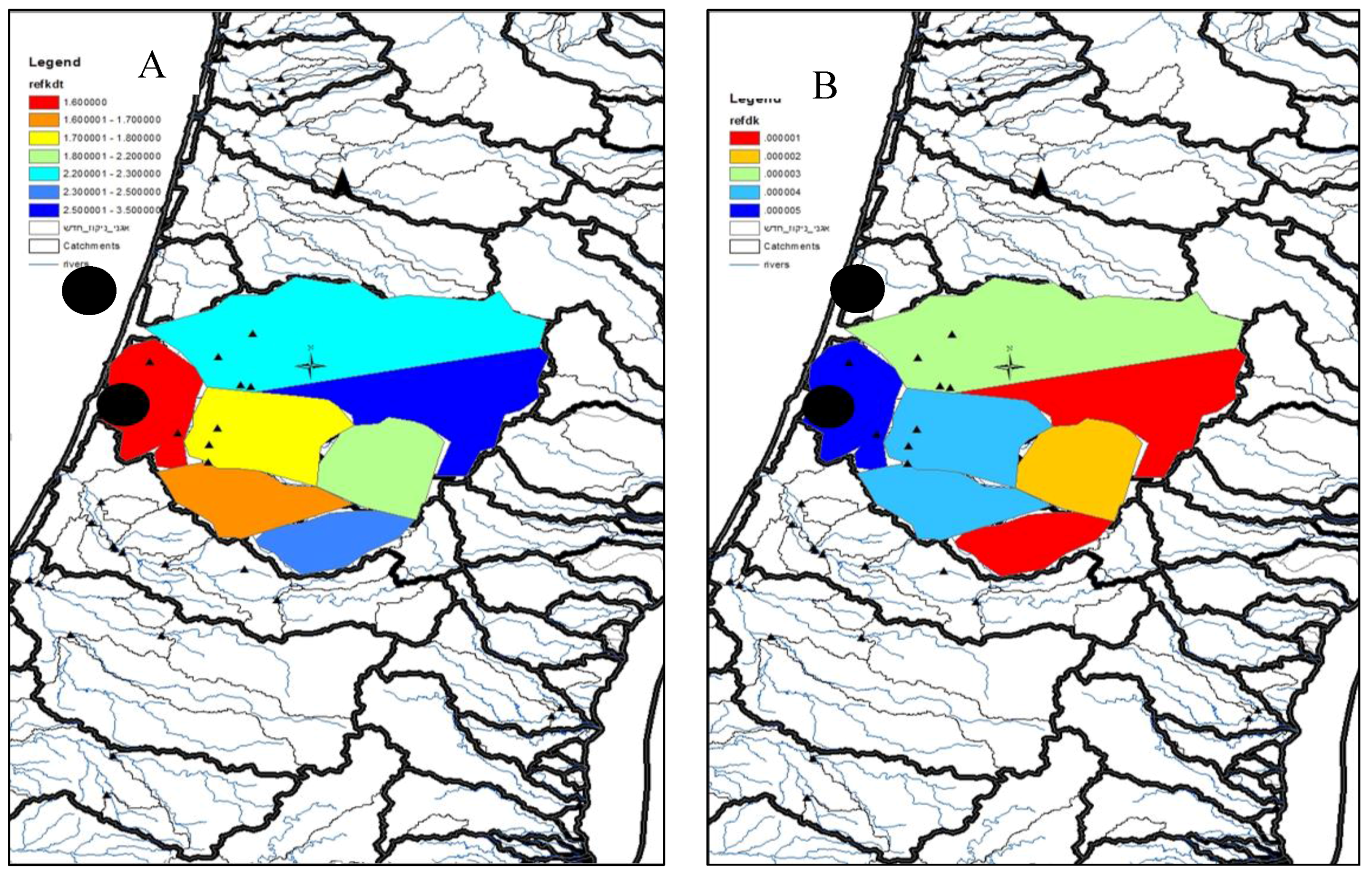 WRF-Hydro different REFKDT (runoff/infiltration rate) and REFDK values (saturation hydraulic conductivity) at the Ayalon basin.