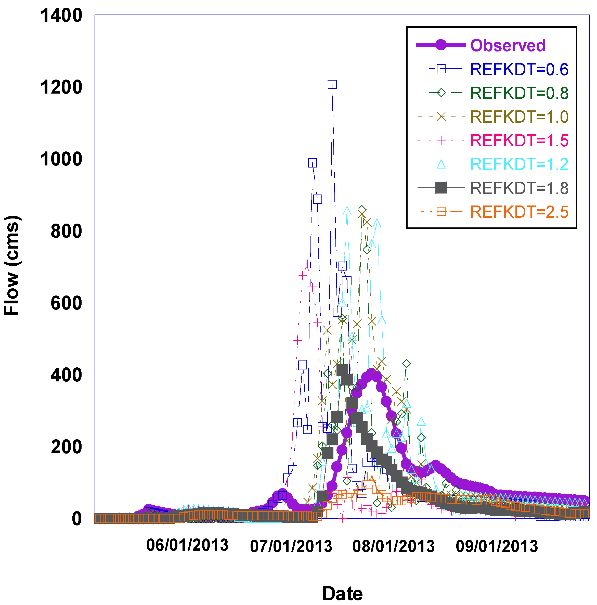The soil hydraulic parameter that corresponds to the scaling of saturated hydraulic conductivity for silty clay loam (REFDK in WRF-Hydro) and the Infiltration/runoff generation parameter (REFKDT) were manually calibrated over multiple simulations. REFDK and REFKDT both are scaling parameters for surface runoff within the Noah_LSM model to control the amount of runoff produced for a given volume of precipitation. In particular, the REFKDT parameter significantly impacts surface infiltration and hence the partitioning of total runoff into surface and subsurface runoff (Schaake et al. 1996 [53]).