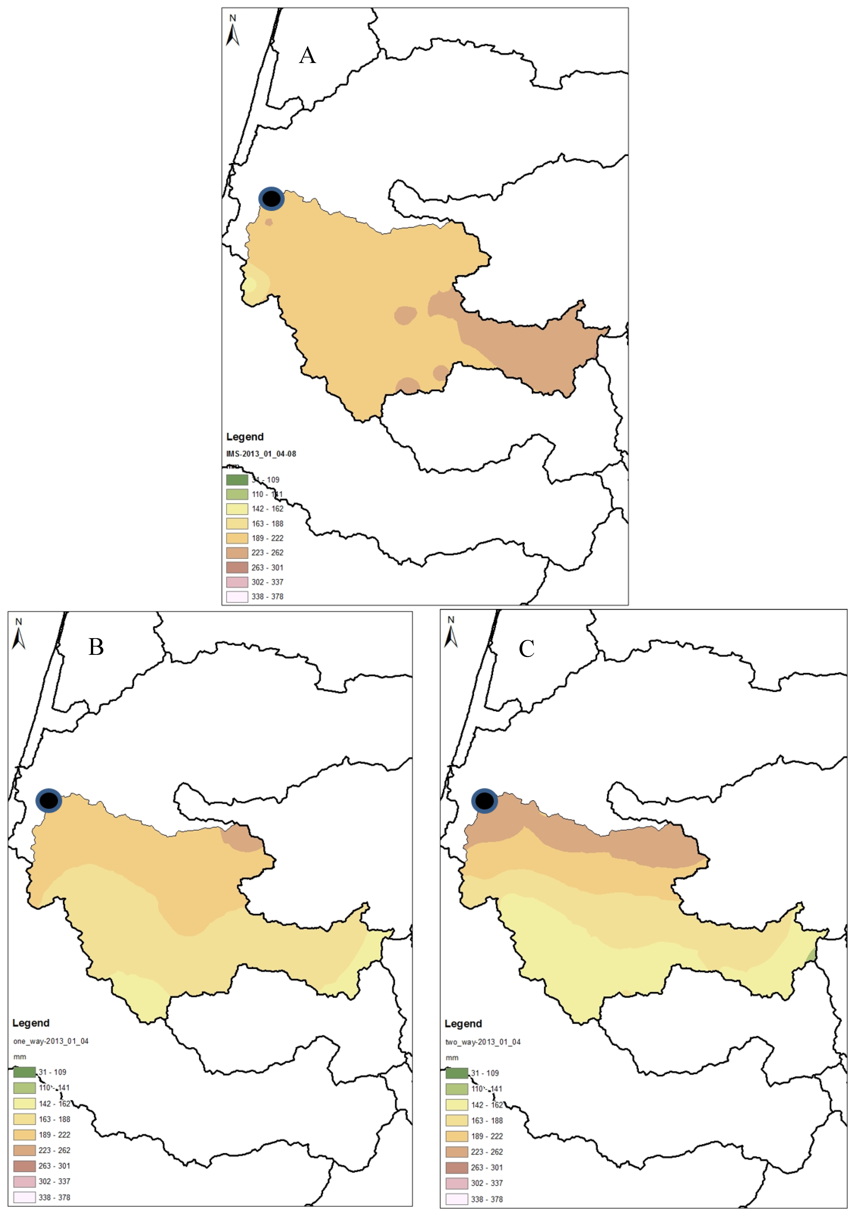 Figure 6A displays the total accumulated observed IMS interpolated precipitation for the Ayalon basin for the January storm (from the 4 January 2013 00:00 to 8 January 2013 23:00), while Figure 6B-C show the WRF one way (Figure 6B) and WRF/WRF-Hydro two way (Figure 6C) simulated precipitation (the black dot in the figure is the Ayalon-Ezra hydrometric station at the outlet of the basin). Figure 7A–C shows the same but for the December storm: Total accumulated (from the 12 December 2013 00:00 to 15 December 2013 23:00) observed precipitation (Figure 7A), WRF-only (Figure 7B) and WRF/WRF-Hydro (Figure 7C) simulated precipitation. Differences between the simulated WRF-only and WRF/WRF-Hydro can be seen in the figures. Both models underestimated the total observed precipitation in the basin at both storms between about 10%–15%, especially at the upper, eastern part of the basin.