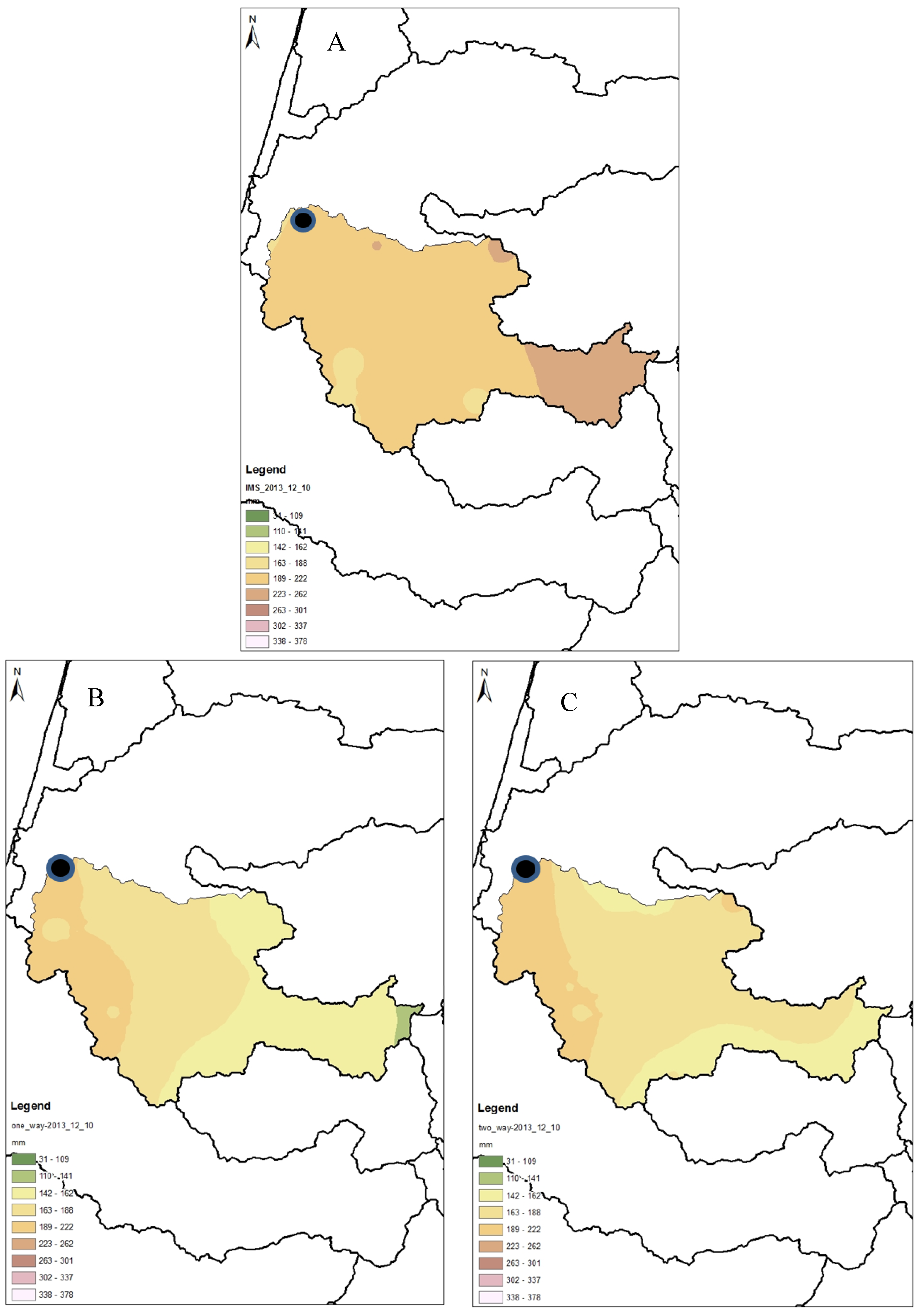 Figure 6A–C: Accumulated observed precipitation at the Ayalon basin for the December storm (A); WRF one way (B) and WRF two way (C) simulated precipitation (the black dot in the figure is the Ayalon-Ezra hydrometric station at the outlet of the basin).