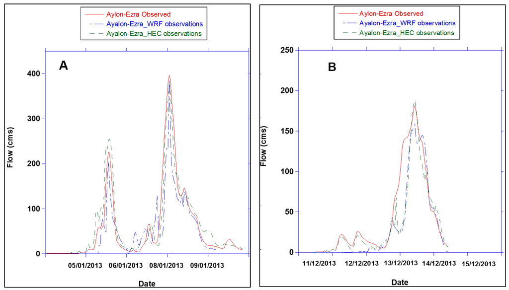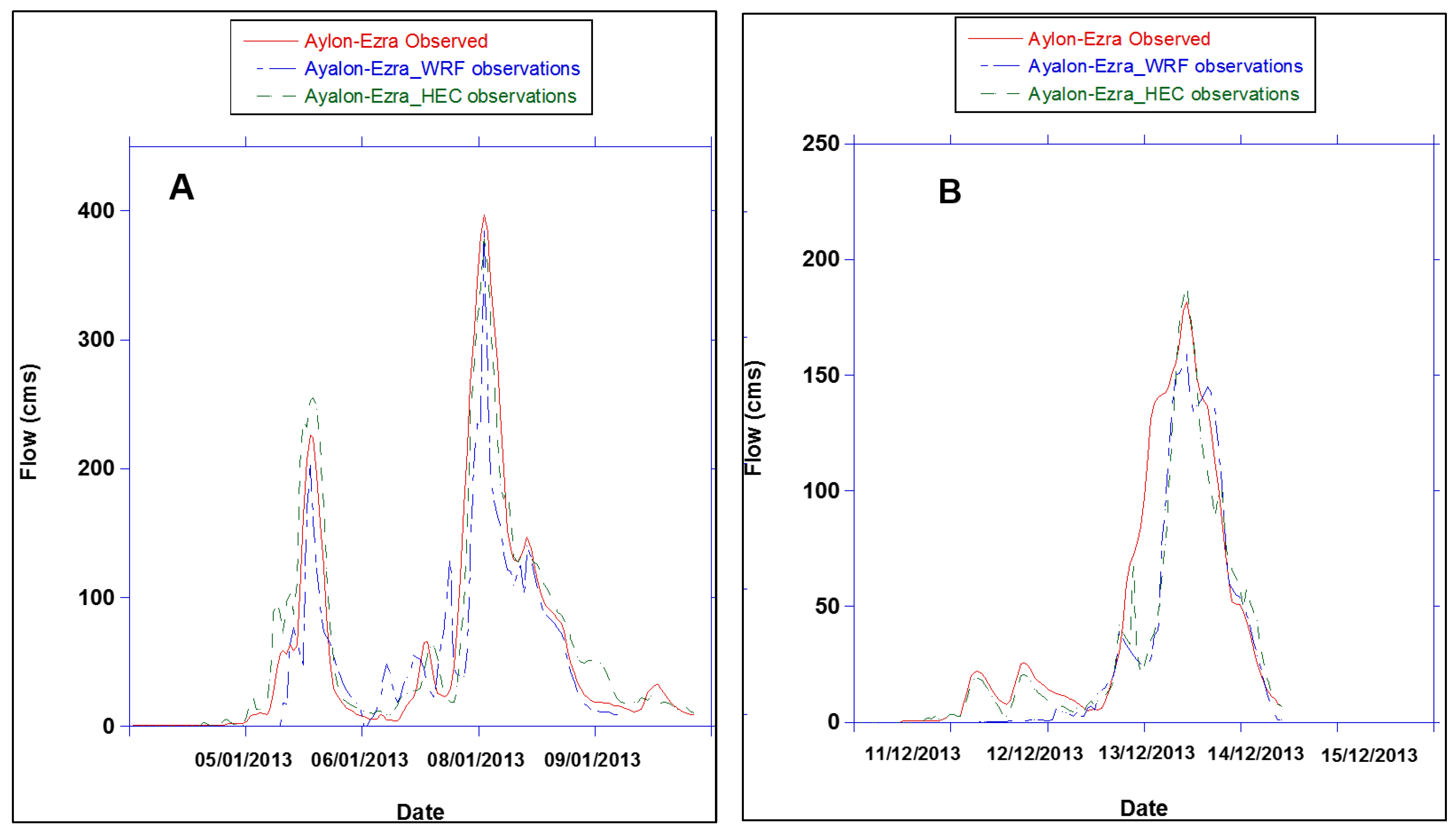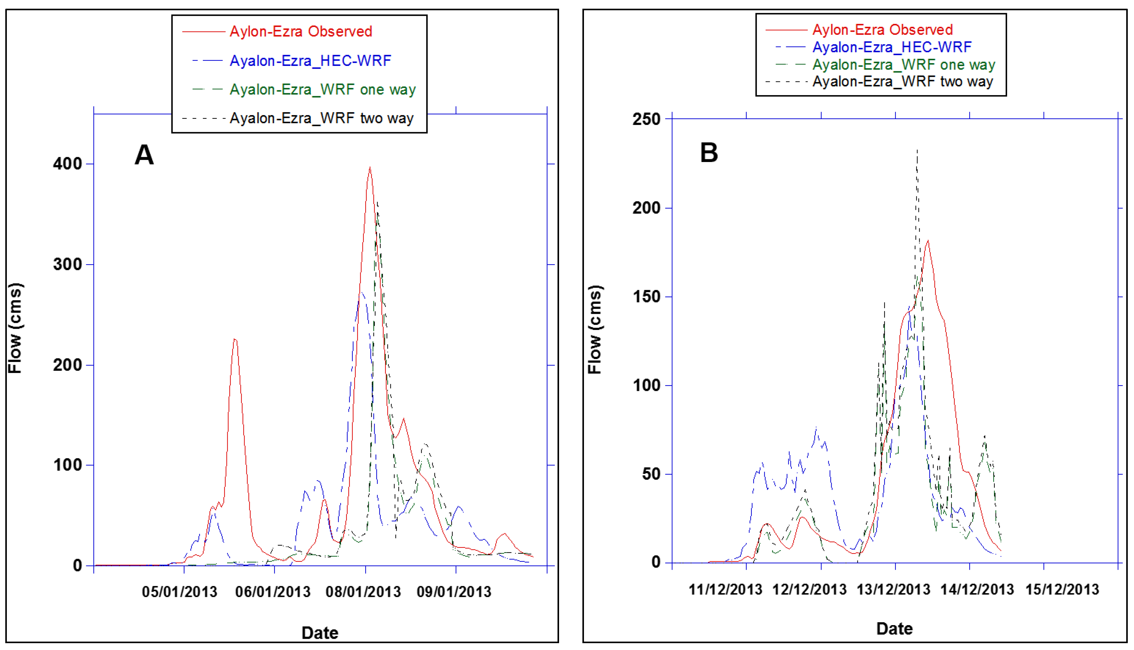 Figure 8A,B display the observed hydrograph at Ayalon–Ezra hydrometric station (red) and the simulated hydrographs for the HEC-HMS (in green) and WRF-Hydro (blue) models when both of them are derived from the same observed gridded precipitation from the IMS rain gauges for the 4–10 January 2013 (Figure 8A) and 10–14 December 2013 storms (Figure 8B). A very good agreement can be seen between the observed and the simulated hydrographs for both models with respect to both peak discharges as well as hydrograph shapes. However, when feeding the models with WRF-simulated precipitation (WRF 1 and 2 way precipitation) much less agreement is found between the observed and the HEC and WRF-Hydro one-and two-way simulated hydrographs. This weaker correlation is displayed in Figure 9A,B for the January (Figure 9A) and December (Figure 9B) storms.
