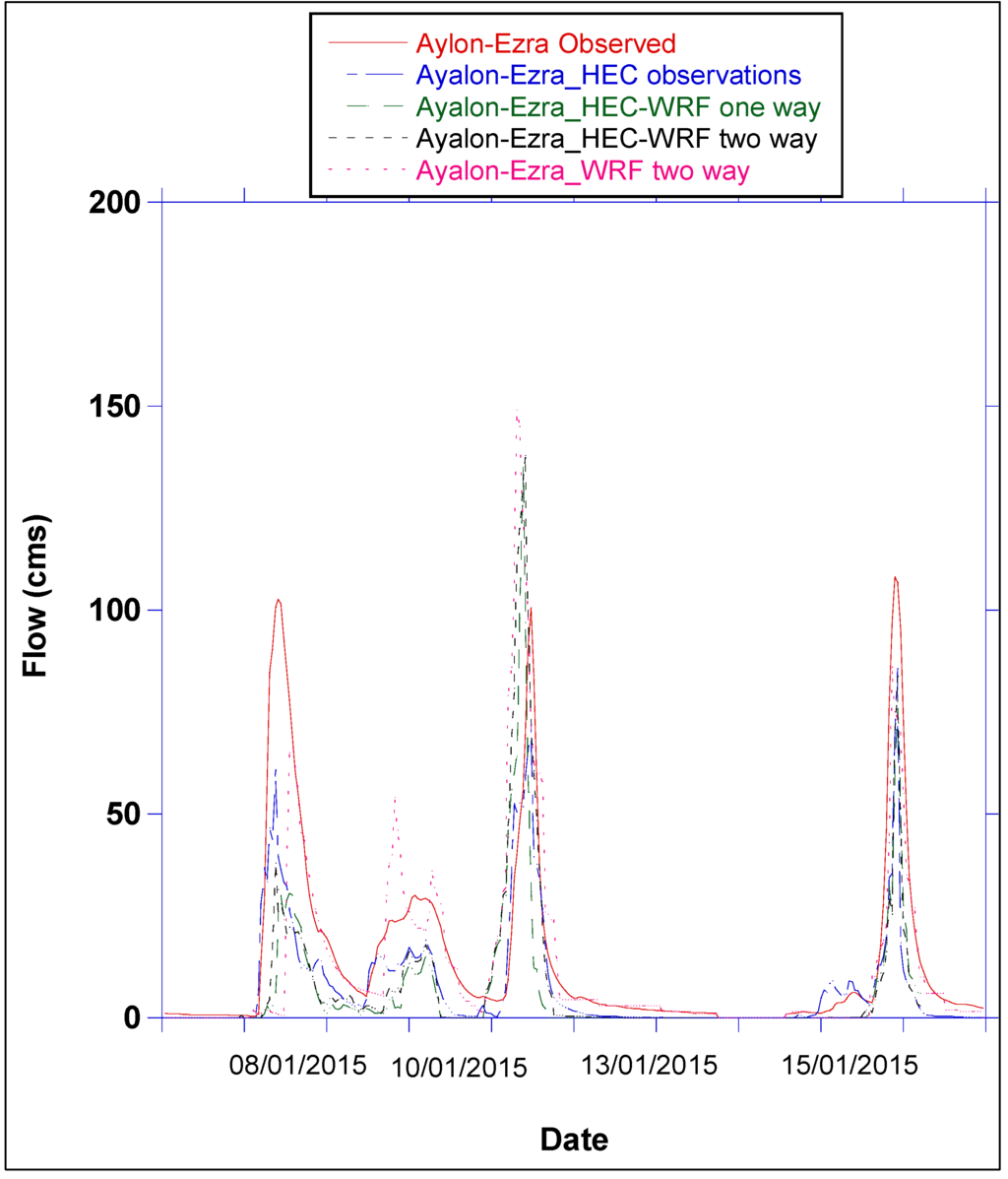 Findings from two major storms in 2013 showed the potential of the WRF/WRF-Hydro two way model (WRF 2-way simulated precipitation) to produce reasonable simulations and potentially better simulations and reduced error than the offline, uncoupled mode. Therefore the coupled WRF-Hydro was run for the full 2014–2015 rainy season and compared with the observation for validation. The model was run for the period 1 November 2014–1 March 2015. Analysis ended in early March since the month was dry, with no significant flow events at all in the Ayalon basin. In addition, we compared the WRF-Hydro results to the HEC-HMS model derived with observed precipitation for two weeks in January 2015 that represented the peak of the 2014/15 rainy season and had three significant flow events in the Ayalon basin.