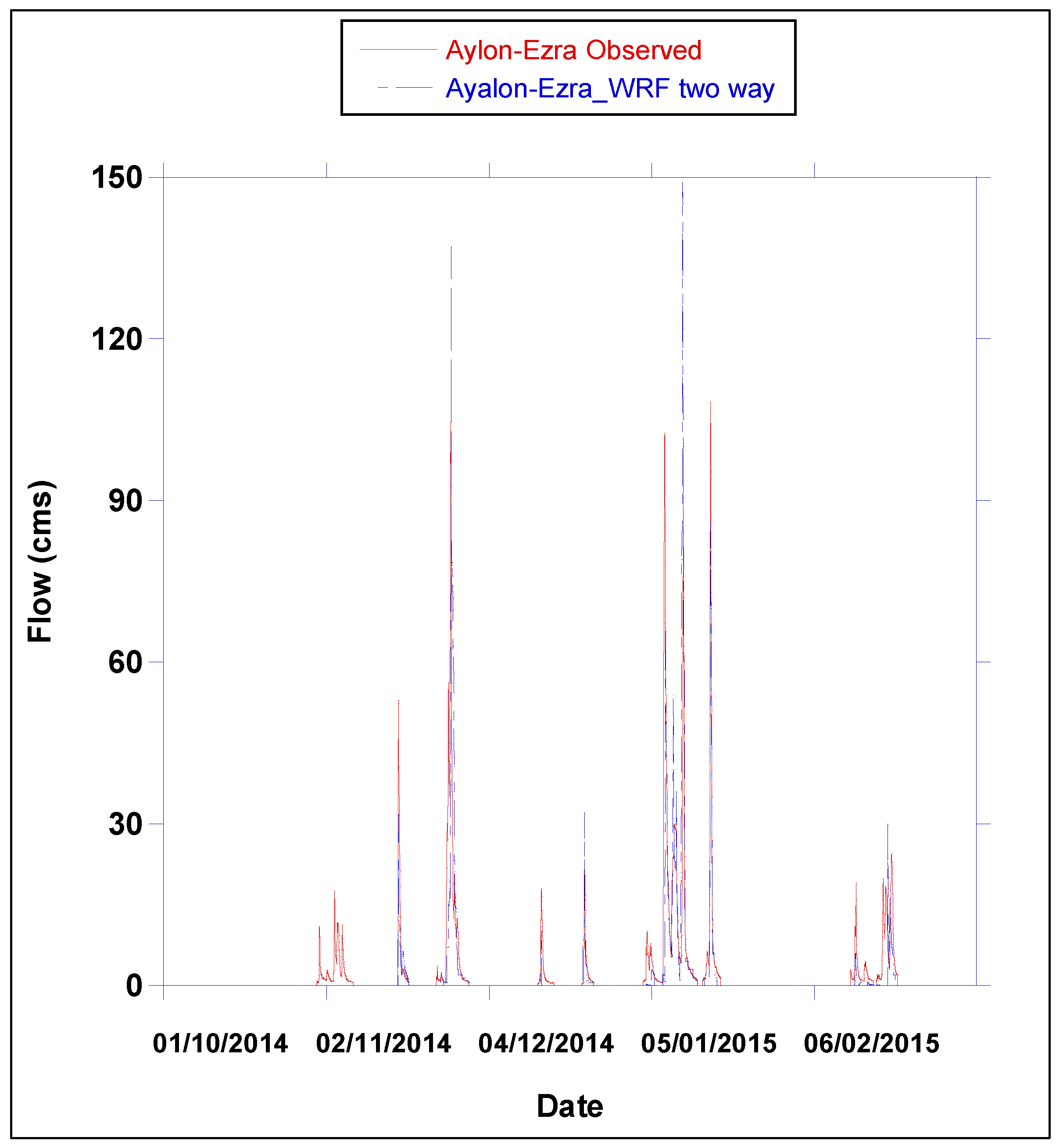Figure 11 displays the observed hydrograph at Ayalon-Ezra hydrometric station (red) for the period 1 October 2014–1 March 2015 vs. the operational two-way WRF-Hydro runs for this basin. The correlation between the observed and model was 0.64 and the NS efficiency coefficient was 0.42. The agreement between the observed and model is not high but still the two way simulation was able to capture major flood events that took place this year (in November and January) and to give early alert.