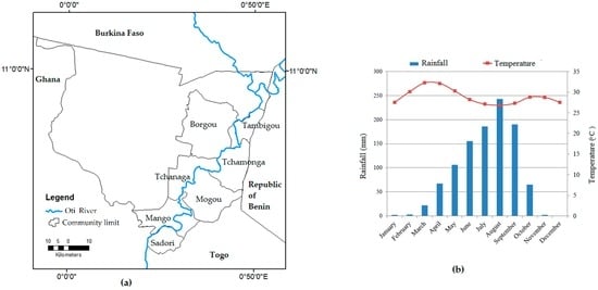 In this study, seven communities of the Oti River Basin in Togo (Figure 1a) are investigated. The climate of this area is tropical semi-arid and is characterized by a rainy season starting from April to October with the maximum rainfall occurring in August (Figure 1b) and a dry season from November to March. With a poverty rate of more than 90% (Table 1), these communities are the poorest in the country. Their livelihoods are derived from subsistence farming, animal husbandry and informal labor, all of which are threatened by the impacts of climate change. Most of the dwellings in the studied area are informal self-housing units, poorly planned and made of mud walls, wooden doors and windows. Consequently, many buildings collapse from the force of the flood water.