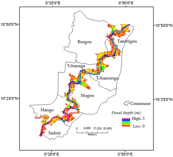 The application of CBDRI method requires a questionnaire (Table S1) to be administrated at the commune level. In total, seven communities—Sadori, Mango, Mogou, Tchamonga, Tchanaga, Tambigou and Borgou (Figure 1a) in the Oti and Kpendjal prefectures of Togo—were selected for this study because of their proximity to the Oti River. In each community, one questionnaire was completed. In order to get reliable information, only knowledgeable people (members of the local development committee, formal community leader, teacher, etc.) were contacted to fill out the questionnaire. However, some data such as population density (V1), population growth rate (V2), number of housing units (E1) access to basic services (V4) and literacy levels (V6) were obtained from Population and Housing Census data of 2010 [20] and literature. In addition, the percentages of forested area for each community area and flood-prone areas were derived from the FAO (Food and Agriculture Organization) land cover database [22] and NASA MODIS data, respectively. Since the data regarding the hazard factor should be obtained from scientific sources [12], the information on the experienced flood hazards was obtained from the literature while the probability and severity of the possible flood hazard (H2 and H4 ) were obtained through flood hazard mapping of the Oti River Basin.