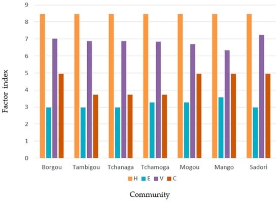 Figure 3 shows the indices of the four factors that contribute to the risk in the CBDRI model. The high level of hazard index can be explained by the repeated and catastrophic floods that have impacted the communities of the Oti River Basin during the last two decades (1998, 2007, 2008 and 2010) and the high level of simulated flood depth, while the observed elevated vulnerability index (V) is mainly due, for instance, to the high poverty level of the communities, insufficiency of access to safe drinking water and the little awareness of the majority of the community members regarding their own flood risk.