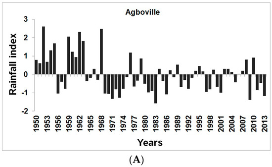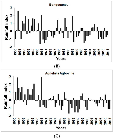 At the local scale (Figure 2A,B), variability in rainfall signal appears to be similar to that at the basin scale. However, disparities appear in some years. Indeed, rainfall in a given year may be in a surplus throughout the basin and in a deficit at the local scale and vice versa. For example, 1950 was dry for the basin scale but wet at the Agboville station (Figure 2A). Therefore, the definition of a surplus or deficit year remains linked to the spatial scale chosen, as indicated also by Lawin et al. [13].