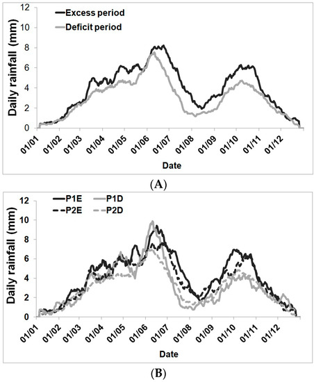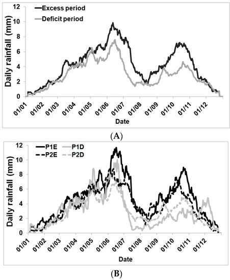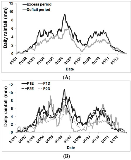 Average seasonal cycle composite: (A) Excess and deficit periods. (B) Excess (P1E: before 1968 and P2E: after 1968) and deficit (P1D: before 1968 and P2D: after 1968) in the Agneby watershed in Agboville.