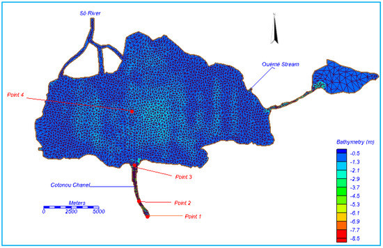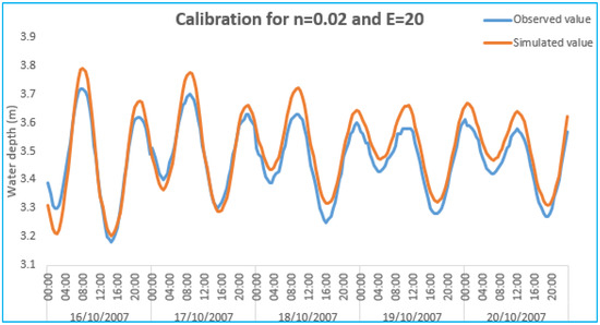 The calibration of a model is done by qualitative comparison of short time series of water depth produced by the numerical model with field data for the same place and the same period [18,19]. The model’s different data (tide, flow rates, velocity and wind direction) are imposed simultaneously.