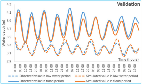 Variation of the water depth observed and simulated in flood and low water period during validation.