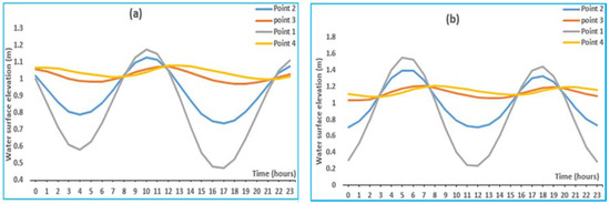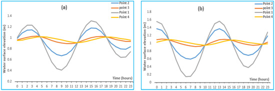 Variation of the water surface elevation simulated with average (a); and high (b) tidal amplitude in low water period.