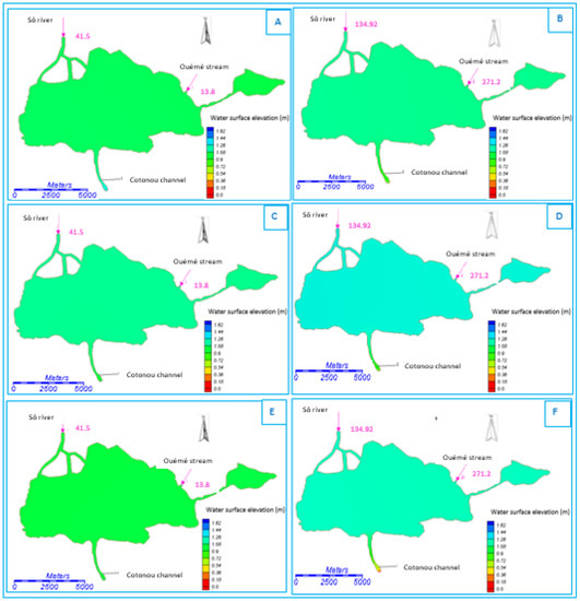 Spatial and seasonal variation of the water surface elevation. (A) Low water period/Average Tidal amplitude/High tide; (B) Flood period/Average Tidal amplitude/High tide; (C) Low water period/High Tidal amplitude/High tide; (D) Flood period/High Tidal amplitude/High tide; (E) Low water period/High Tidal amplitude/low tide; (F) Flood period/High Tidal amplitude/low tide.