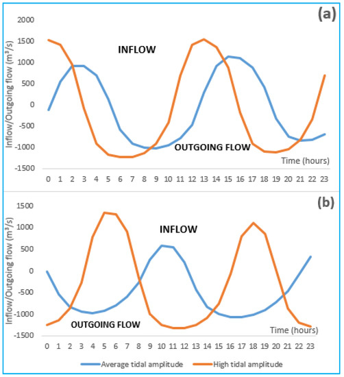 During a low water period, specifically with average tidal amplitude, there is an average incoming flow of +726 m3/s and −707 m3/s for outgoing flow. However, with high tidal amplitude, the average outgoing flow is −833 m3/s and +1167 m3/s for average incoming flow (Figure 9b).