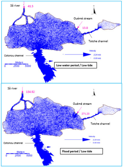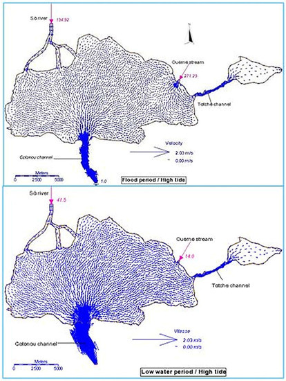 From the analysis of the figures, we can deduce by the flows exchanged during flood period, that the outflow is greater than the inlet flow. This is explained by the contribution of a large amount of water in the lake, from tributaries of the Lake (Sô River and Ouémé stream), which also discharges in the sea and Porto Novo lagoon [17]. So during a flood period, the dynamics of the lake are controlled by the tributaries and to a lesser extent by the tide. However, in periods of low water, the dynamics of the lake are mainly controlled by the tide. Here, in both average and high tidal amplitude, the incoming flow is higher than the outflow.