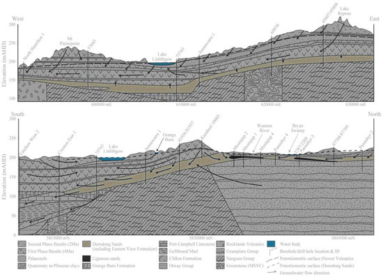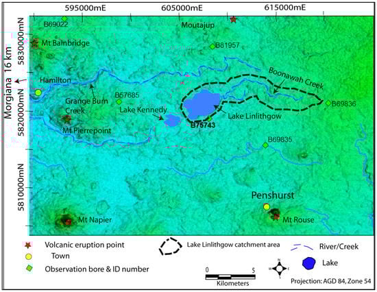 The disruption of the drainage system by the basalt flows formed the lakes in the center of the catchment. Lake Linlithgow sits on first phase (~4 Ma) basalts, and is encircled by second phase (~2 Ma) basalt flows, forming a relatively flat lakebed with steep banks. Lunettes occur on the eastern and northeastern margin of the lake, ~4 m above the current maximum lake level [50]. There is a local groundwater flow system around Lake Linlithgow [32,55], and a regional to intermediate groundwater flow system in the surrounding volcanic plain (Figure 4).