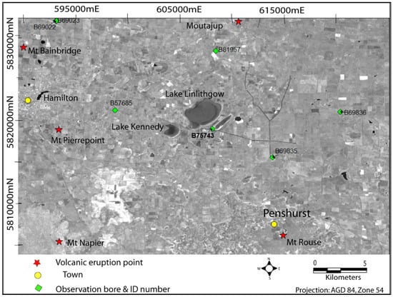 - Bennetts, D. Hydrology, Hydrogeology and Hydro-Geochemistry of Groundwater Flow Systems within the Hamilton Basalt Plains, Western Victoria, and Their Role in Dry Land Salinisation. Ph.D. Thesis, Department of Earth Sciences, La Trobe University, Melbourne, Australia, September 2005. [Google Scholar]