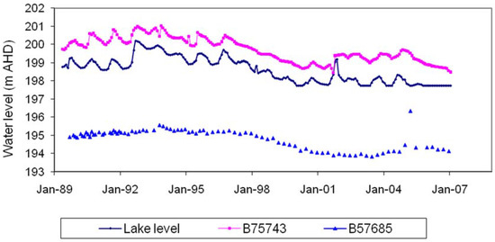 Potentiometric surface contours for the Newer Volcanics aquifer indicate that Lake Linlithgow is a groundwater through-flow lake, with groundwater flow entering the lake from the east and leaving towards the west (Figure 4). Groundwater enters through a series of springs and seeps along the eastern lake margin, mostly from the second phase basalt aquifer, which terminates here [50,54,55,56]. Hydrographs from bores in the basalt aquifer surrounding Lake Linlithgow (Figure 5) show a strong correlation with the lake level. The declining trend of 20 cm/year from 1997 to 2001 is clearly a response to below-average rainfall [14]. The palaeosols lying between successive basalt phases hinder outflow from the lake and act as barriers to groundwater flow (Figure 6).