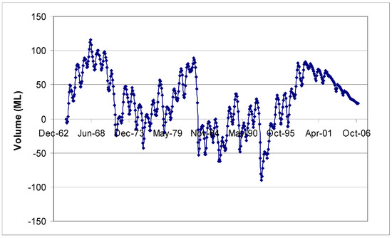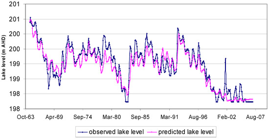 Surface inflow to Lake Linlithgow is received through Boonawah Creek, for which there are no gauging data available. Surface inflows can, however, be estimated by the tanh cumulative surplus rainfall approach [42] using the Grange Burn flow, which is gauged at Morgiana (gauge no. 238219; Figure 1), because the Grange Burn and Lake Linlithgow catchments are adjacent and have similar topography, soil type, vegetation, land use, and rainfall. The tanh cumulative surplus rainfall approach provides a tool with which runoff in Grange Burn can be predicted for any given monthly precipitation/evaporation (Figure 10). Using area scaling, this can be converted to a flow in Boonawah Creek; the catchment areas for Boonawah Creek (at Lake Linlithgow) and Grange Burn at Morgiana are 85 km2 and 997 km2, respectively.