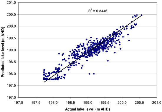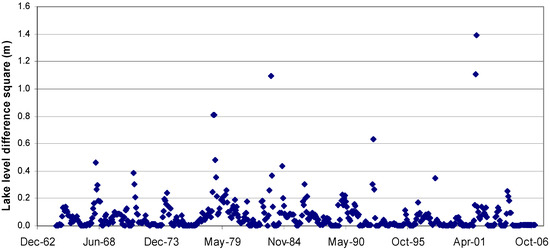 The predicted lake levels show good agreement with the measured lake level data (Figure 11), with an r2 value of ~0.85 (Figure 12). The sum of the squared differences did not exceed 0.4 m, except for a few outliers (Figure 13).