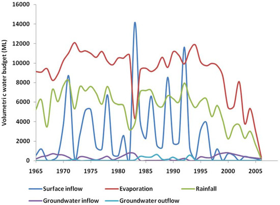 The effect of groundwater is evident from the graph. The simulated volumetric component of the groundwater of the lake water budget is shown in Figure 17. The base flow is estimated (G = 260) (Figure 10) using the tanh cumulative surplus rainfall approach. This simplistic model seems a reliable and modest tool to see the lake–groundwater relationship at a glance and will be useful if constrained by the mass balance and reliable estimate of parameters [9,32,51]. This approach could be adopted for much wetland management. This model will give insight into the groundwater–surface water relationship and guide our future data gathering from sensitive parameters. The parameters used are small and convenient for management practice.