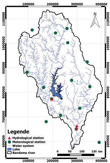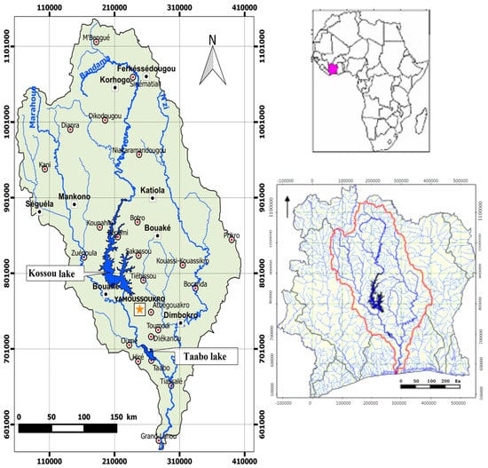 Figure 1 shows the Bandama basin located in Côte d’Ivoire. The Bandama river is one of the four major rivers of the country. Its source is located north of Côte d’Ivoire between Korhogo and Boundiali. There are three major tributaries: White Bandama (22,293 km2), N’zi (3500 km2), and Marahoue (19,800 km2). The Bandama basin spreads over three different climatic and hydrographic regions because its regime follows the rainy season. Its northern part is characterized by dry sub-tropical climate (between 1000 mm and 1700 mm). This area has a unimodal rainfall distribution or pattern with distinct wet (rainy) and dry seasons. The central (equatorial climate) and southern (humid equatorial climate) parts of the basin are characterized by two rainy seasons. In the equatorial climate, the annual rainfall is greater than 1500 mm. The amount of rainfall is higher in the humid equatorial climate, with a yearly mean of 1800 mm. As described in previous studies [19,20], the lithology is characterized by the Birimian formations (volcanic, volcanogenic, and sedimentary formations) and granitoid Eburnean comprised of granitic solid masses in which several generations of granites are distinguished. Alterites and fracture aquifers provide a year groundwater supply linked to the underground grid of fractures [21]. Previous studies [22,23] have shown that groundwater recharge is highly dependent on rainfall and varies between 50 mm and 354 mm in the Bandama basin. Vegetation cover in the Bandama catchment varies from north (savannah) to south (forest). Topography of the Bandama catchment is gentle, with a maximum elevation of 809 m above sea level.