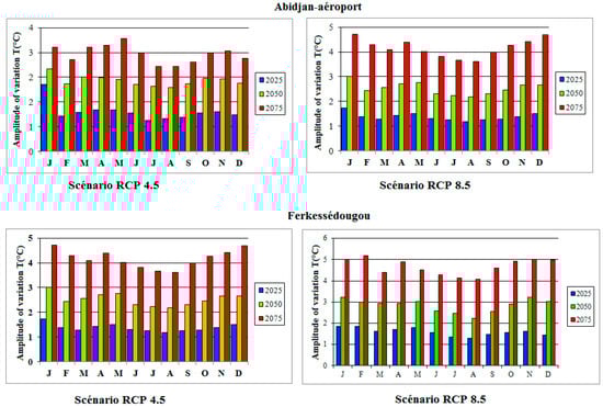 Amplitude of variations in monthly temperatures at different horizons according to the HadGEM2-ES model in the Bandama basin.