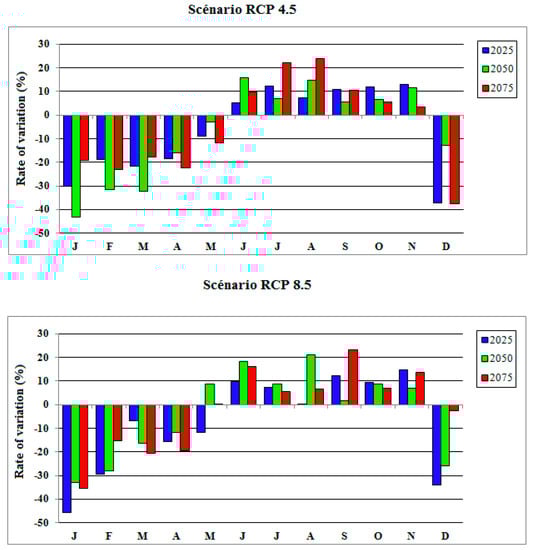 Comparison of the mean monthly hydrographs for the three time horizons with that of the baseline period shows that the annual hydrological pattern for the Bandama, Nzi, and the Marahoué catchments remains unchanged (Figure 6a,b). The changes caused by climate change affect runoff volume in the watershed. However, the trends in river discharge are different for each scenario. Under RCP 4.5, mean monthly runoff increases for all horizons. For the Marahoué and Bandama river, the changes are important from July to October. For the N’zi river, mean monthly runoff increases gradually from March to November. The findings are in accordance with the works of [31] on the Sassandra basin in Côte d’Ivoire under several scenario (A1, A2, B1, B2, A1B). Under RCP 8.5, runoff is projected to slightly decrease up to the horizon 2025, then to decrease at the horizons 2050 and 2075. Runoff is projected to vary mainly in tributary rivers. The works in the Comoé basin of [33] with the ReGcm model and A1 scenario, revealed a decrease in runoff of 18.8% to 34% in 2031–2040 and 40% to 73% in the 2091–2100 horizon.