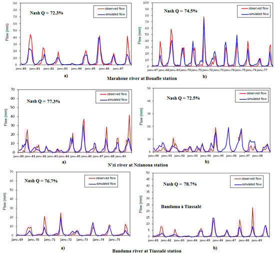 Impacts of climate on water resources were assessed using a hydrological model. The hydrological model GR2M calibration was performed for the periods 1980–1989 (N’zi river), 1980–1987 (Marahoué river), and 1969–1975 (Bandama river). Calibration is the process of choosing the best sets of model parameters, by automatically adjusting their numerical values to better mimic the response observed at the outlet. For these different periods, the Nash performance coefficients are 72.3%, 77.3%, and 76.7% respectively (Table 2). Validating a model means to the check the reproducibility of the results by the calibrated parameters. The model validation was done using one period by selected river: 1990–1998 (N’Zi river), 1967–1977 (Marahoué river), and 1969–1975 (Bandama river). The results shows that the simulated and observed monthly runoffs are very similar with the Nash coefficients greater than 70% (Figure 5).