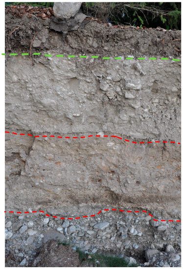 Exposed cut bank along the left bank of Cougar Creek between the pedestrian bridge and Elk Run Boulevard. The two dashed red lines delineate a massive matrix-supported hyperconcentrated flow deposits overlying a fluvial deposit. The unit below and above the green dashed line is likely construction fill. BGC photograph of 23 July 2013.