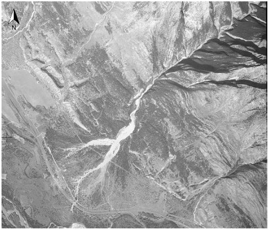 Small debris flood events (<~10,000 m3) cannot be reliably identified from the aerial photographs unless they have led to avulsions from the main channel. The difficulty in observing evidence of debris flood activity was in part due to limitations in photograph scale and quality. However, the ambiguity of new event activity was largely due to the extensive channelization work that occurred after 1967. Channelization was achieved to restrict flooding and debris flooding to the artificial channel and limit the potential for avulsions. The series of air photographs from 1950 to 2008 shows no evidence of extreme debris flood activity as there are no new channel avulsions. These photos are therefore only informative in showing a lack of large events from 1950 to 2012 and provide no evidence for either the frequency or the magnitude of smaller events. Evidence of debris flood and flood activity was also difficult to discern due to development around the banks of the channel and subsequent lack of revegetation.