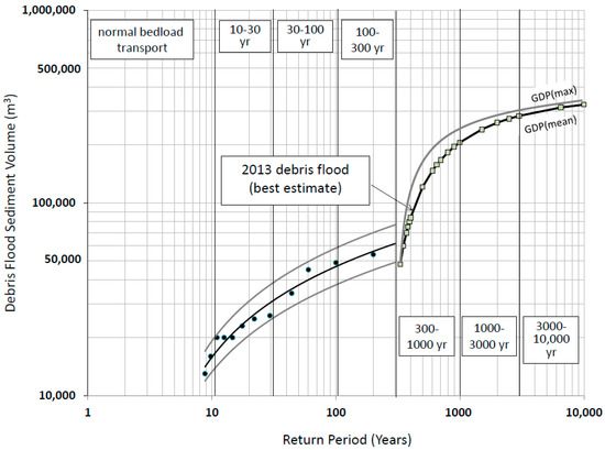 The process-based separation of debris floods is believed to coincide with the change from the 100–300 to the 300–1000 years return period and a corresponding approximate total sediment volume of 100,000 m3.