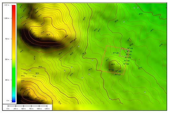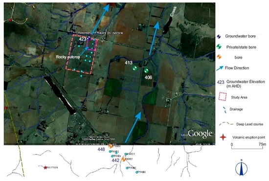 These data for hydraulic conductivity (K) indicate that the productivity of the aquifer in the hypothetical site area is likely to be low [27,28]. However, the productivity of the aquifers is likely to be enhanced within closer proximity to the recharge point (e.g., toward the granite outcrop). The average linear seepage velocity (V) is calculated using the equation below: