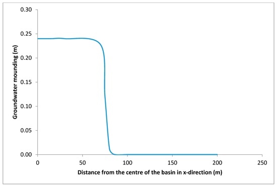 Mounding was modelled at peak discharge/percolation for the site, and it was concluded that there will be no problems with mounding at the site/in the vicinity. The maximum thickness of the saturated thickness beneath the centre of the basin at the end of the infiltration period will increase by 0.24 m (Figure 5), and the impact of the (lateral spreading) mounding will be insignificant/nil past 75 m from the centre of the basin.