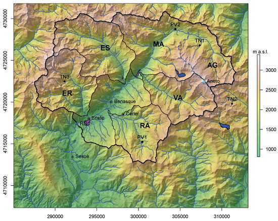 Map of the area of study. Coordinates are Universal Transverse Mercator UTM zone 31. The Ésera catchment and sub-catchments are shown. ER: Eriste, ES: Estós, MA: Maladeta, RA: Ramascaró and VA:Vallibierna, the Aiguallut endorheic sub-catchment is indicated by AG. Aneto, to the northeast is the highest peak in the range. Main towns are indicated by their full name and sensors listed in Table 1 by their acronyms. River network and natural lakes are drawn in blue and artificial dams in purple.