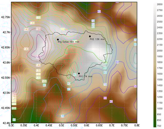 Simulated precipitation [mm] contour map by the WRF, in black is the Ésera catchment. Background colour is model surface elevation as indicated by the legend on the right side. The points indicate accumulated precipitation measurements at two tipping bucket pluviometers and in a totaliser pluviometer at the Refugio de Estós (Estós mountain Hut). The totaliser data is provided by Serrano Notivoli et al. [68], but they have not been verified.