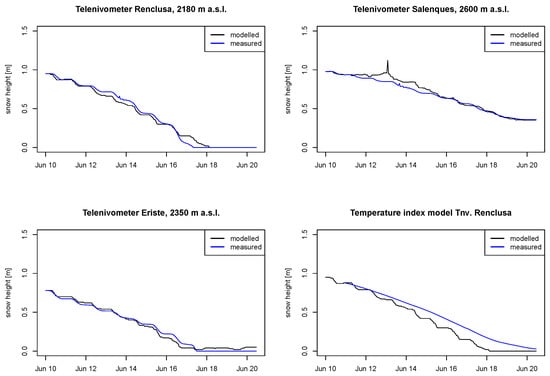 The simulation of snow melt at a single point is successful, with a mean Nash-Sutcliffe efficiency value of 0.98 (Table 3) and suggests that the energy balance approach to simulate snow melt is a reliable one. This approach works well both for clear days, when solar radiation is the main energy input, and for overcast and rainy days, when the main energy input are turbulent fluxes with the atmosphere and there is an additional influx of long-wave thermal radiation. There is some discrepancy at the highest snow gauge where the model underestimates the amount of fresh snow on the 13th of June. This is probably due to a simplistic estimation of snow-rain limit which does not take into account the precipitation rate. WRF modelled temperature is very similar to measured temperature, but unfortunately we do not have measured data on short-wave radiation, long-wave radiation nor albedo. A full meteorological station measuring these variables would be of great help to test further the reliability of the WRF model. It is interesting to note that the mean slope of ablation rate changes very little after the 17th of June on the highest snow gauge, even when there is a drop of temperature of almost 10 degrees. The reason may be the increase in downwelling long-wave radiation from a cloudier atmosphere, which compensates for the reduced energy input from lower air temperature and reduced solar radiation. This highlights the remarks of Pomeroy et al. [79] on the unsuitability of simplistic temperature index models to simulate snow ablation and rain on snow episodes. These type of models can perform very satisfactorily when there are hardly any data available (e.g., [80,81]), but are more limited for application ROS events, as shown in lower right panel of Figure 5.