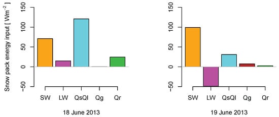 During the day when peak flow occurred, the snow energy balance was dominated by a positive influx of energy from turbulent interchange with the atmosphere. Both sensible heat and latent heat transfer were positive, indicating condensation of atmospheric moisture on the snow (Figure 7). Shortwave radiation was second in importance, followed by advective heat transfer from the rain. Net long wave was positive, contrary to most days when there is an effective radiative cooling of the snow pack. Simulated subsurface fluxes were negligible during the ROS event, except for a short period early on the 19th of June when there was a positive flux toward the surface snow pack. For the calculation of heat transfer due to rain (Equation (A28)) it is necessary to know the temperature of the rain. Byers et al. [70] measured rain temperatures and found that after an intense precipitation event rain temperature was always close to air temperature (about 1 °C difference). For this study we assumed that the rain temperature was 1 °C colder than the air temperature. During the time of peak precipitation, simulated lapse rates above the surface were in the range between −0.003 and −0.0045 °C m−1, thus one degree colder means that the rain had the temperature of a layer between 200 and 300 m above the surface.