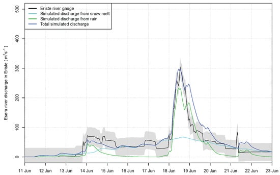 Figure 8 shows the observed and simulated discharge at Eriste gauging station, the grey uncertainty shade is ±30 m3s−1 corresponding to the intake of the hydroelectric plants. The peak discharge is well represented in the simulation (Nash-Sutcliffe coefficient of 0.76), but the river flow seems to decrease very slowly, with a secondary peak in precipitation that is larger than the observed variation. Rainfall is the main contribution to peak flow. Snow melt contribution is very well simulated before the ROS event, which adds confidence to the snow model results. Snowmelt was the main contributor to total water discharge during the previous days. Discharge was larger than the average for the season, probably causing saturation of soils and a very fast hydrological response to the rainfall event. During the flood event of the 18–19th of June estimated snowmelt represented 33% of total runoff, on the day of maximum precipitation (the 18th) snowmelt was calculated as 28% of total discharge and 23% at the time of peak flow.