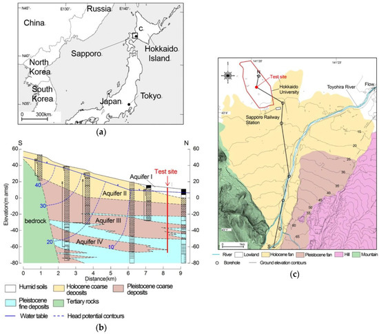 Figure 1a,b illustrate maps of the test site at regional and local scales, respectively. The test site is located at 43°03′06″ N and 141°15′25″ E at Hokkaido University, Sapporo, Japan. Sapporo is a capital city in the northern island of Japan, Hokkaido, and has been developed on and around the Toyohira River alluvial fan. Figure 1b shows that the alluvial fan is surrounded topographically by mountains to the northwest, hills to the northeast, and lowlands to the south. The radius of the fan is approximately 7 km, and the area is approximately 31 km2. The fan consists of a western Holocene fan and an eastern Pleistocene fan [18]. The Holocene fan contains the subsurface groundwater reservoir. The test site is located on the lowlands near the alluvial fan. The topographic slope of the lowland area is less than 1%; thus, the groundwater flow velocity is moderate for BHE performance.