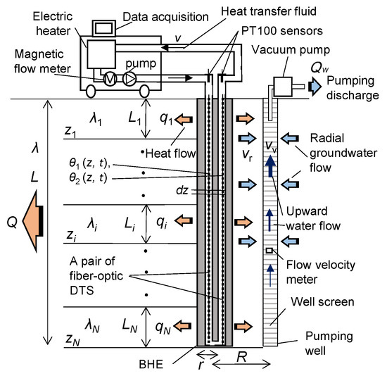 Ground source heat pump systems (GSHPs) have been increasingly established for heating and air conditioning in residences and commercial buildings owing to their energy efficiency, ubiquitous availability, and environmental friendliness [1,2]. Among a variety of ground heat exchangers, closed loop borehole heat exchangers (BHEs) are the most widely used. BHEs consist of a high-density polyethylene U-tube(s) in a vertical borehole of a depth of approximately 100 to 300 m. The performance of a BHE in a GSHP is dependent on the effective thermal conductivity around the BHE. The effective thermal conductivity is variable, with ranges between <1 W m−1 K−1 in unsaturated fine sediments and >3 W m−1 K−1 in dense consolidated rocks [3]. In addition, the effective thermal conductivity may increase in aquifers with groundwater flow velocities sufficiently high for heat advection relative to the conduction, i.e., the Peclet number is of order 1 in principle [4]. Several numerical studies have indicated that the threshold of the groundwater flow velocity for the advection effect is commonly on the order of 0.1 md−1 [5]. The threshold velocity was also evaluated on the same order by other numerical studies [6,7,8]. Such high velocities of groundwater flow are limited to cases in which both hydraulic gradients and conductivities are relatively high, such as in unconsolidated gravelly aquifers beneath steep slopes [4]. Therefore, the design and planning of GSHPs typically do not take into account the groundwater flow effect on the performance of a BHE.